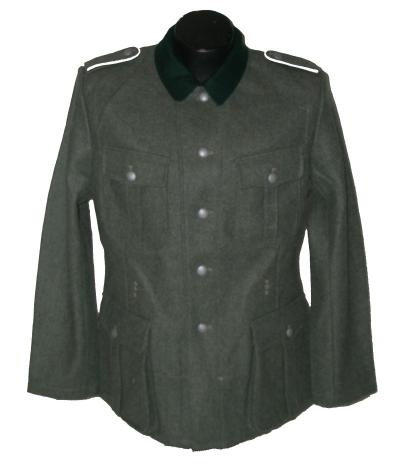 field gray wool M43 tunic. These tunics have all the details of the originals: 6-button front, hook and eye collar, belt hook holes, acetate lining, split cuffs, collar bind buttons, first aid dressing pouch, shoulder board loops, etc Available in sizes 40, 42 ,44 ,46 ,48 ,50. Comes with either SS or Army insignia, your choice. shoulder boards , collar tabs , sleeve or breast eagle. $139.95 |