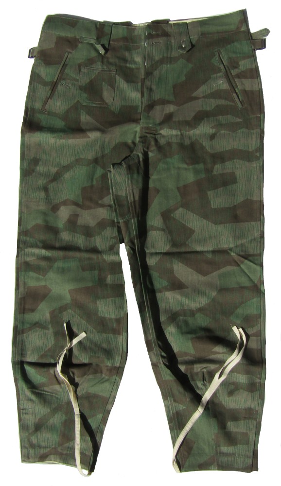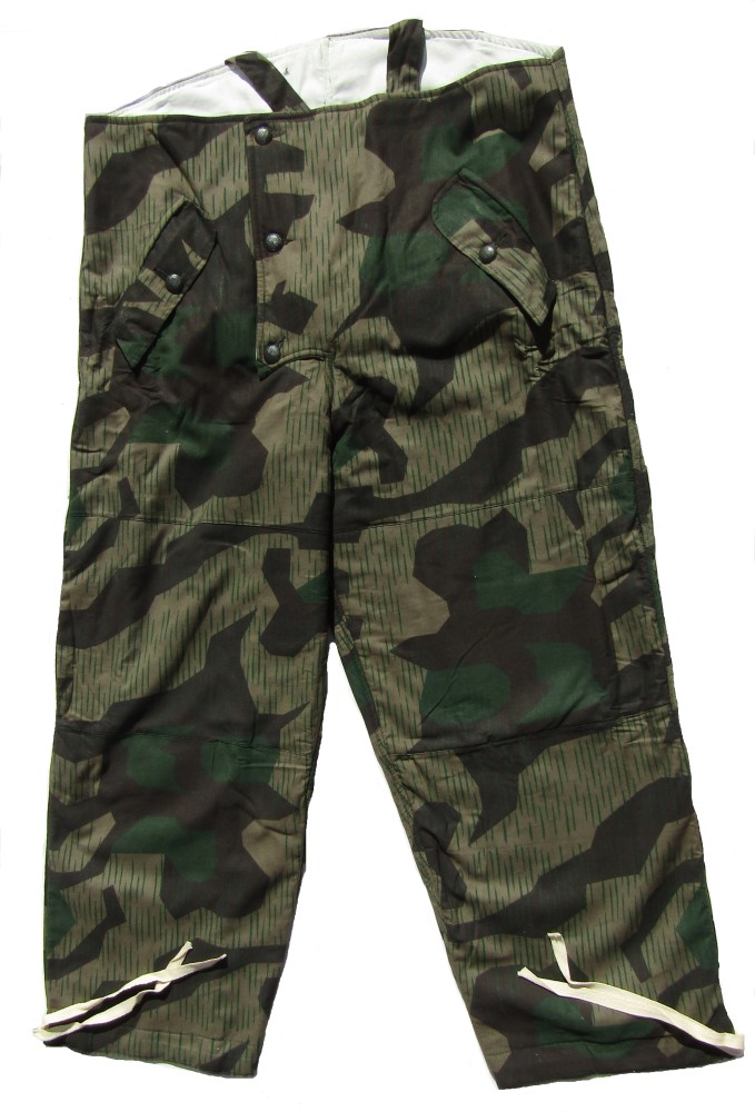 WW2 splinter pattern pants.Fall side out.These pants are straight leg and have 2 adjustable side belts,4 belt loops, suspender buttons, 2 front slash pockets with button closure, 1 rear pocket with button closure, 1 watch pocket with button closure, and partial lining. $39.95 SALE |