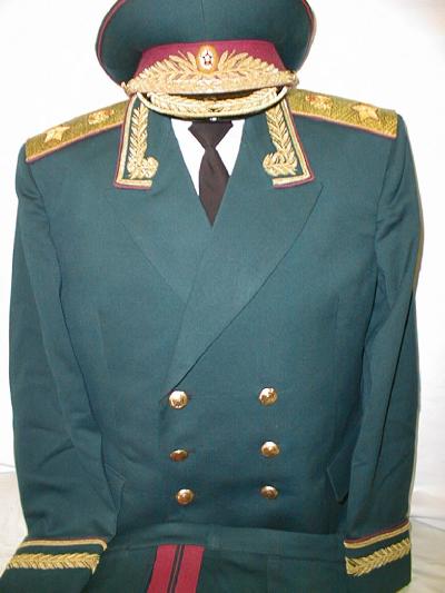 insignia. Shoulder boards have the large embroidered green embroidered Marshal star with embroidered Soviet coat of arms.Breeches are olive with red generals stripes.With visor.ribbon bar.$950.00 |