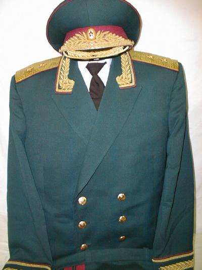 everyday uniform. Jacket,breeches,visor.Jacket has red piping around cuffs and collar, gold embroidered leaves on collar.Large ribbon bar including ribbons for 2 Orders of Lenin.Breeches have red general stripes.Visor has red piping and gold embroidered wreath around Generals kokarde.This rank was used from March 1958 to 1973. About size 58-4.$800.00 |