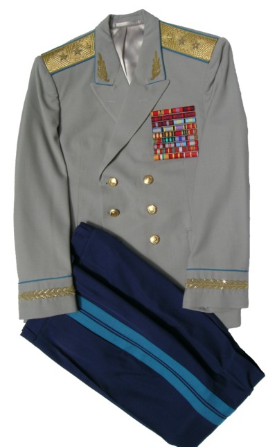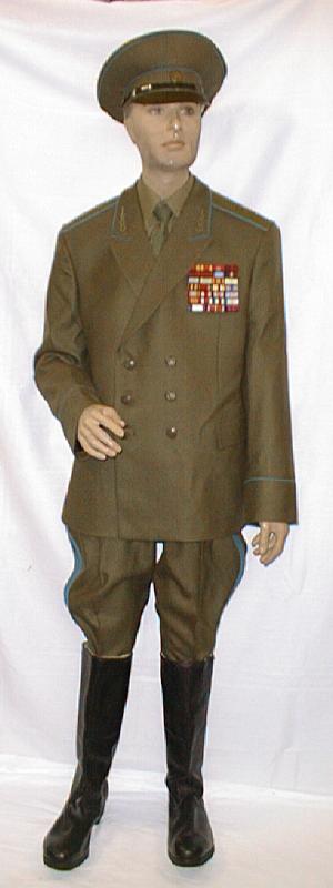 everyday uniform. Complete with jacket,pants,and visor.Jacket has light blue piping and gold embroiderd leaves on collar.Pants have light blue generals stripes.Shoulder boards have embroidered marshal star with gold embroidered wreath and embroidered winged propeller.Size 56-4.$950.00 |