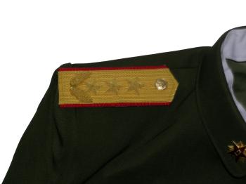 General uniform. Includes jacket,pants,hat. Nice heavy fabric, well marked. Have hat sizes 58,59. Shoulder boards have 3 embroidered gold stars and wreath. Size of the jacket is 44-46, pants 38" waist. $475.00 Beautiful uniform. Also available in Jacket size about 42 ", waist size 36" |